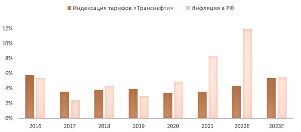 У «Транснефти» понятный механизм роста выручки за счет ежегодной индексации тарифов на 99,9% от прогнозируемой инфляции. Текущий прогноз МЭР предполагает инфляцию на 2023 год в размере 5,5%, что подразумевает индексацию тарифов «Транснефти» на 5,4%. Основным минусом подобной схемы индексации является частое расхождение между фактическим размером инфляции и прогнозом МЭР. Например, тарифы на 2022 год были проиндексированы на 4,3%, а инфляция, согласно последнему прогнозу, может превысить 12%.