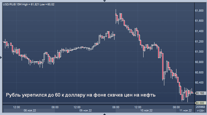 Рубль укрепился до пятинедельного максимума около 60 по отношению к доллару в начале торгов в пятницу, так как цены на нефть подскочили с двухнедельного минимума, а американская валюта ослабла по всем направлениям на фоне замедления данных по инфляции в США.