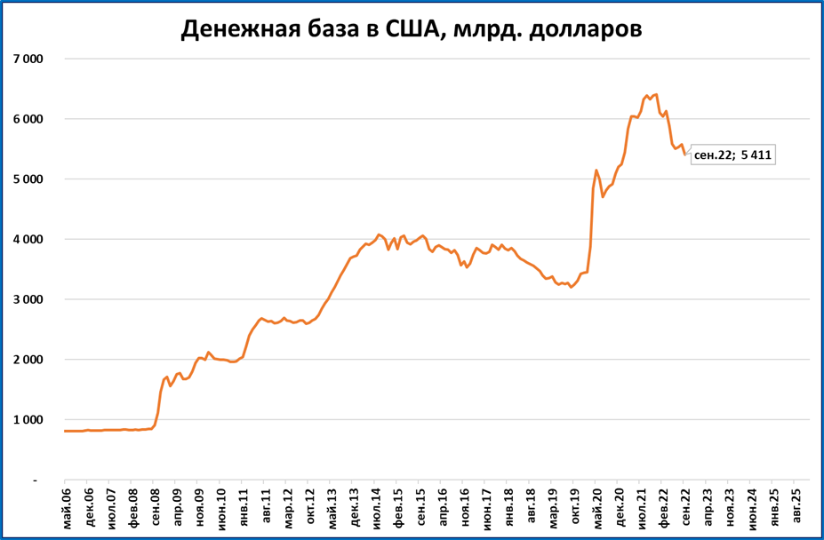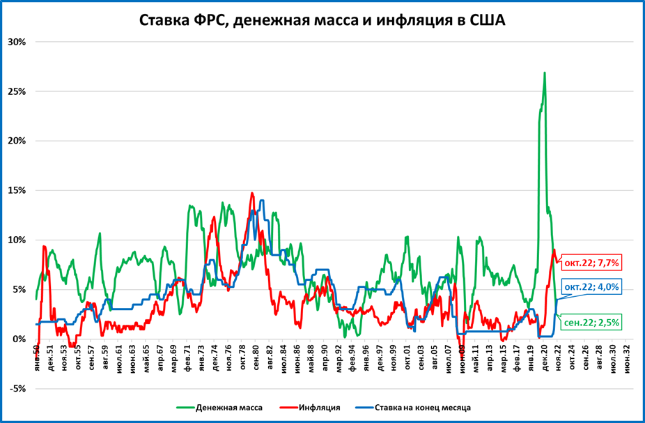 Прогноз: судя по продолжающемуся сжатию денежной базы Федрезервом, замедление темпов роста денежной массы продолжится. Это значит, что динамика РДМ может ухудшаться, даже при снижении инфляции.
