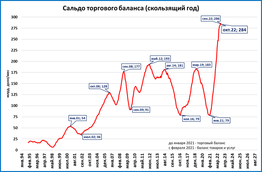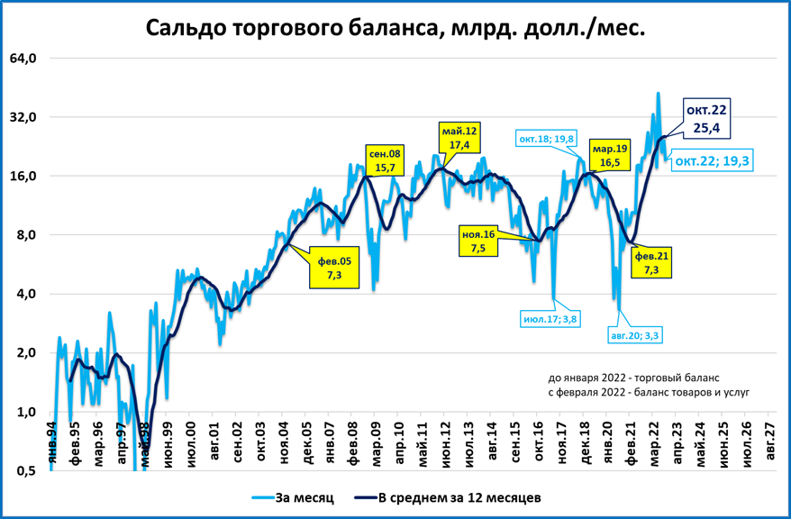 Важно отметить два момента: (а) сальдо по товарам (без услуг), вероятно, выше, так было традиционно; (б) нынешний уровень сальдо соответствует рекордным уровням периода до 2021 года (см. выноску октябрь 2018 года).