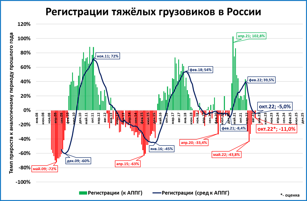 Несмотря на то, что падение в октябре немного ускорилось по сравнению с сентябрём, очевидно, что низшей точкой падения остаётся май 2022 года.