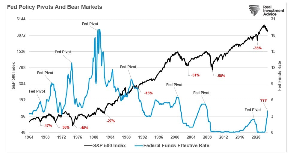 Это оставляет только две траектории для денежно-кредитной политики. Первый вариант заключается в том, чтобы центральные банки приостановили рост ставок и позволили инфляции идти своим чередом. Это потенциально может привести к более мягкому падению экономики, но теоретически закрепит инфляцию на более высоких уровнях. Второй вариант, и тот, который был выбран, заключается в повышении ставок до тех пор, пока экономика не погрузится в более глубокую рецессию. Обе траектории неблагоприятны для акций. Последнее существенно более рискованно, поскольку создает экономическое или финансовое “событие” с более серьезными последствиями.
