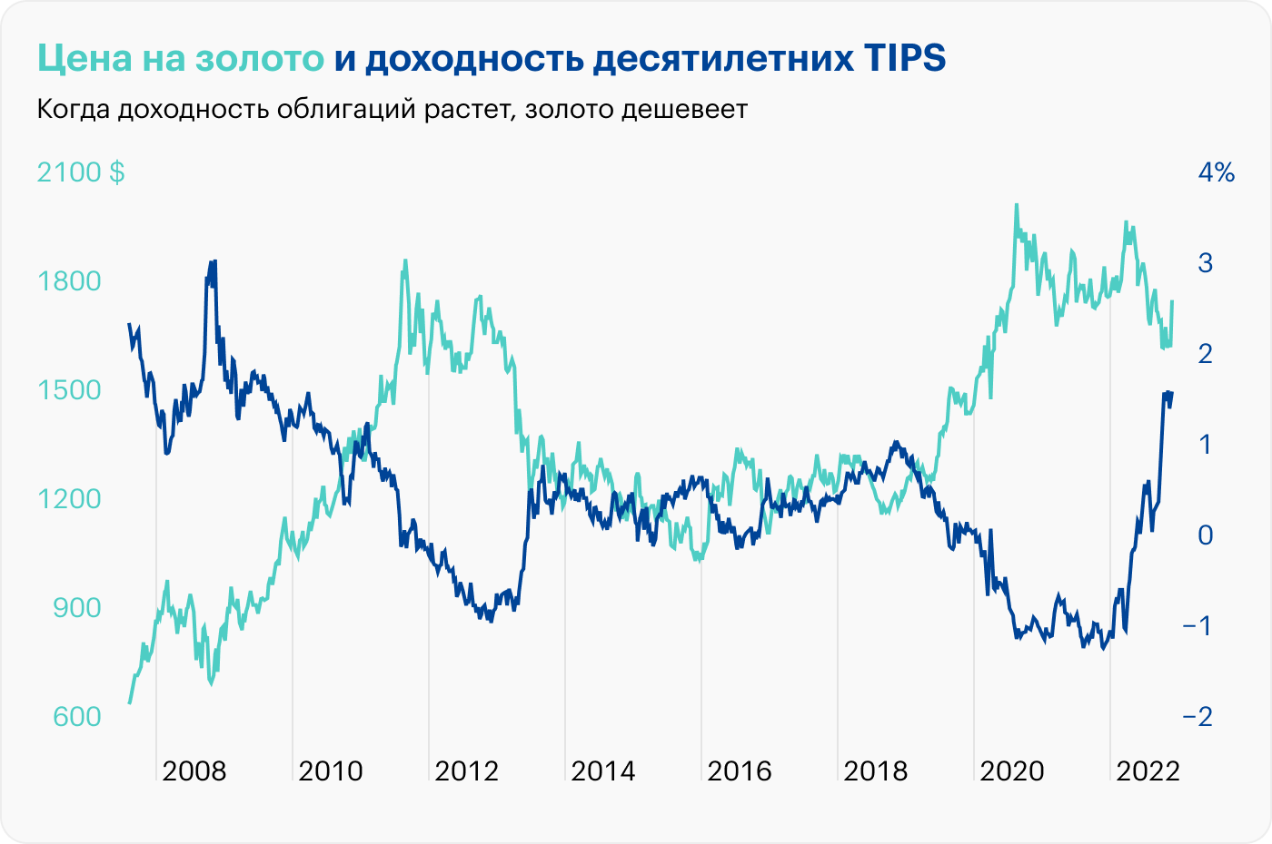 С начала 2022 года золото в долларах потеряло около 2%. Одна из причин: растущая доходность инфляционных облигаций TIPS. В последние годы у золота и TIPS сильная обратная корреляция. Например, когда доходность облигаций растет, золото дешевеет. Так происходит потому, что инвесторы уходят в TIPS, которые, в отличие от золота, приносят процентный доход.