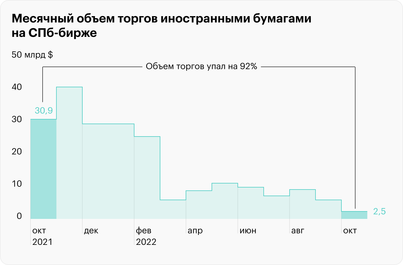 «Разрыв» с Euroclear, «обособление» части акций и «забота» Центробанка о неквалифицированных инвесторах дорого обошлись СПб-бирже: в октябре объем торгов на площадке год к году рухнул на 92%. Комиссионный доход, который зависит от объема торгов, в 2021 году дал бирже 80% всей выручки.