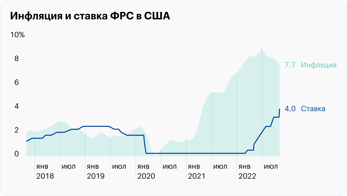 В октябре годовая инфляция в США упала с 8,2 до 7,7%, что лучше ожиданий в 8%. Месячная инфляция также лучше прогноза: 0,4 против 0,6%. Инвесторы надеются, что США прошли пик инфляции и скоро ФРС прекратит повышать ставку. Сейчас ожидания такие: к марту 2023 года ставку повысят до 5%, а уже в ноябре начнут постепенно опускать.