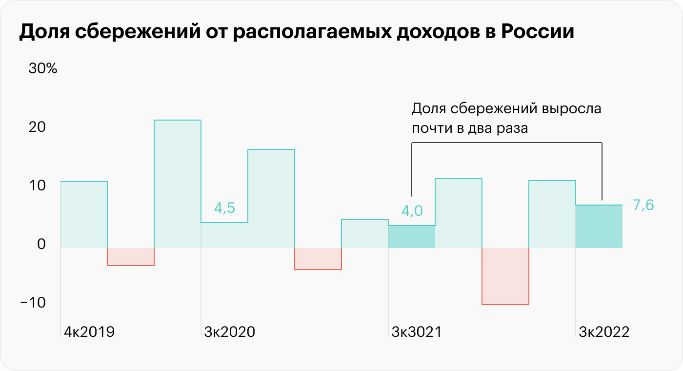 В кризисном 2022 году россияне перешли в сберегательный режим. В 3 квартале они нарастили долю сбережений от располагаемых доходов почти вдвое по сравнению с прошлым годом. Это еще одна причина, почему рост цен затормозился, а розничные продажи упали.