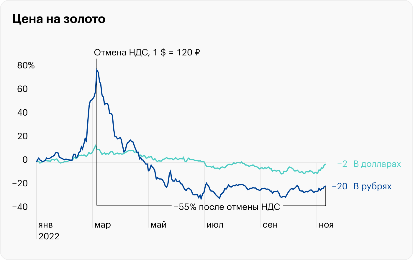 Из-за укрепления рубля совет властей дорого обошелся инвесторам: с марта золото упало вдвое. В итоге 2022 год развеял сразу два мифа. Первый: золото — это защитный актив. Второй: в кризис рубль умеет только падать.