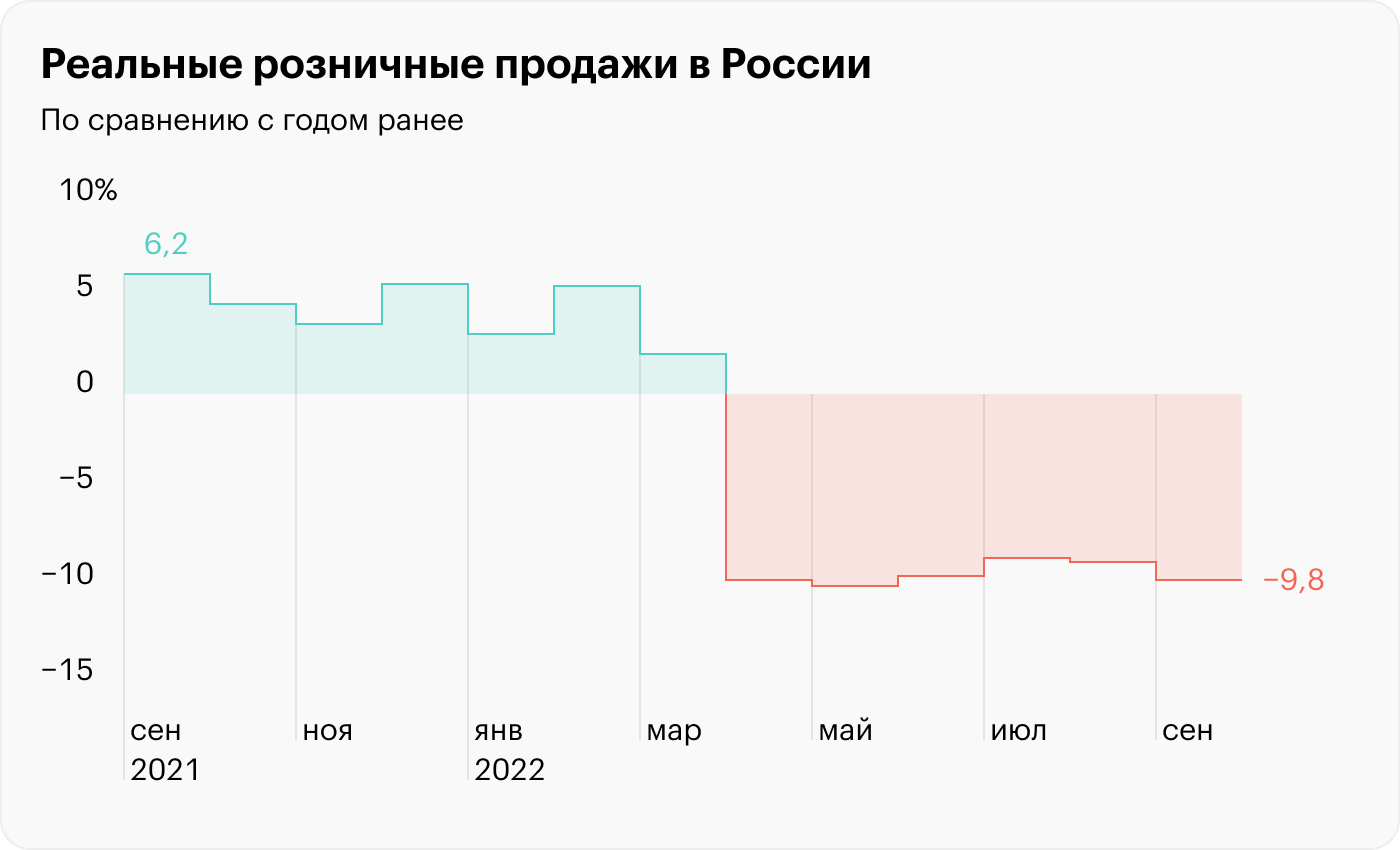 В сентябре номинальный объем розничных продаж год к году подрос на 3,9%, но реальный с поправкой на инфляцию упал на 9,8%. Это значит, что россияне стали покупать меньше, а платить — больше.