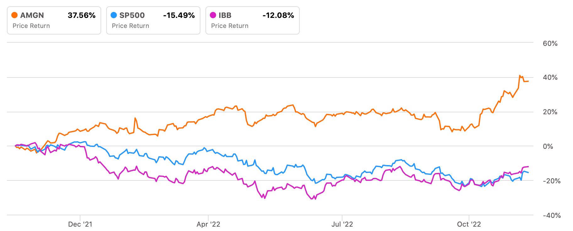 Акции Amgen за последний год значительно опережают по доходности американский индекс S&P 500 и отраслевой индексный фонд iShares Biotechnology ETF. Доходность акций Amgen за 12 мес. составила 38% на падающем рынке.