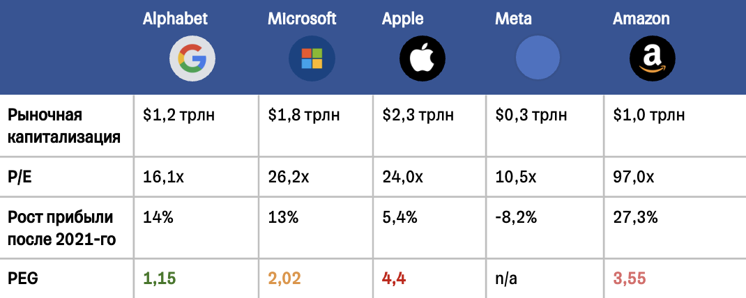 После двузначных показателей в 2020–2021 годах на фоне фискальных стимулов и мягкой монетарной политики прирост выручки Big Tech притормозил. Так, показатели Apple и Google в прошедшем квартале составили 8% и 6% соответственно.