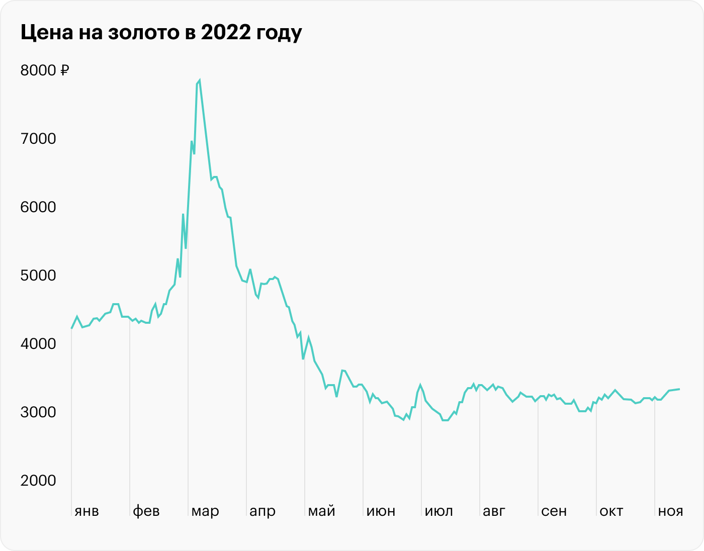 В марте — апреле 2022 года золото преимущественно падало в цене, совершая небольшие отскоки в июне, августе и октябре.