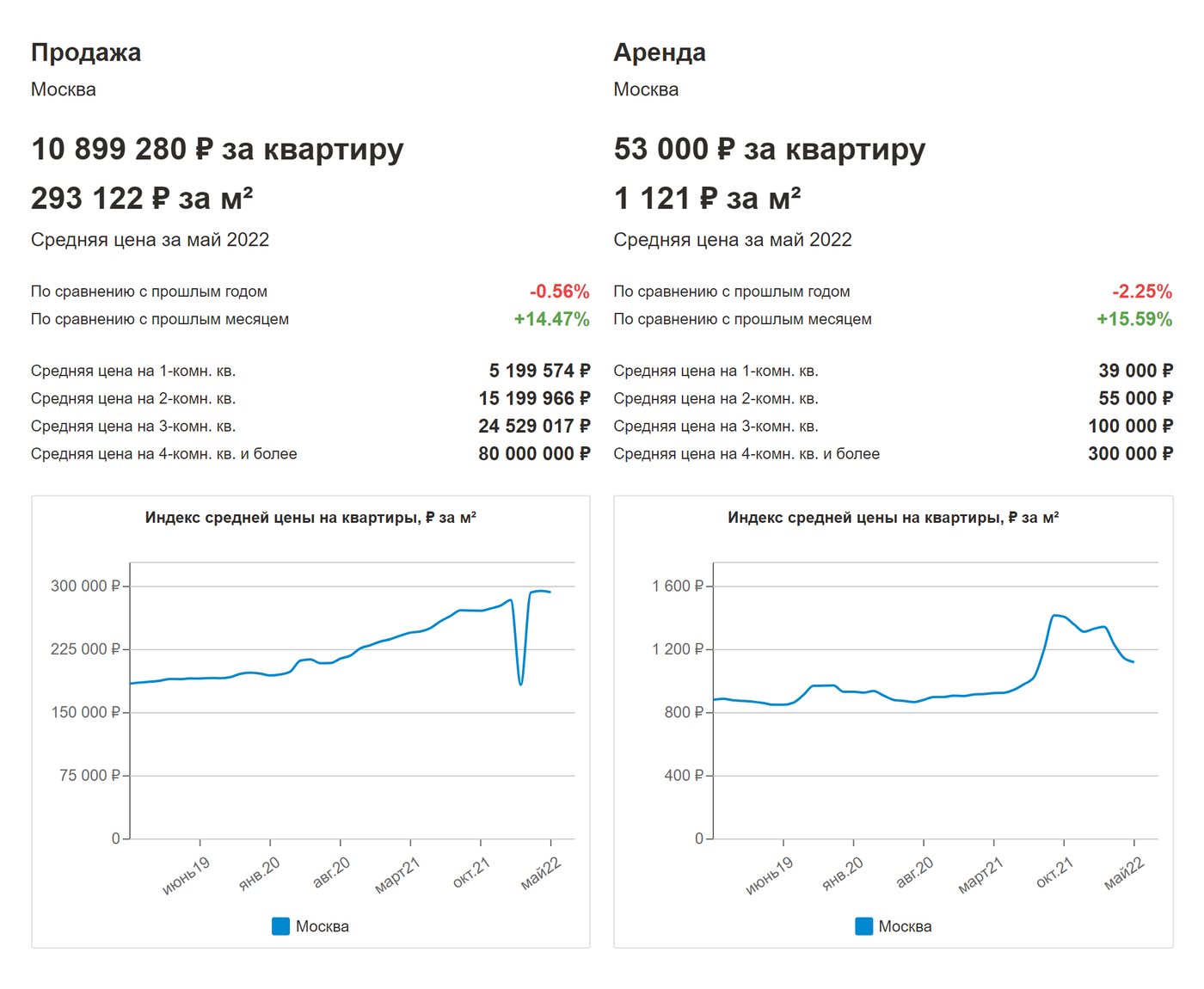 Цены на продажу и аренду квартир в Москве на май 2022 года. Средняя цена однокомнатной квартиры, вероятно, ошибочная: должно быть раза в два больше. Источник: domofond.ru