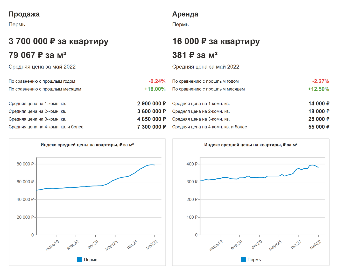 Цена жилья и доход от сдачи. В мае средняя цена однокомнатных квартир в Перми была 2 900 000 Р, а двухкомнатных — 3 600 000 Р. Я специально взял усредненные цены без выбора конкретного района, чтобы не погрязнуть в деталях.