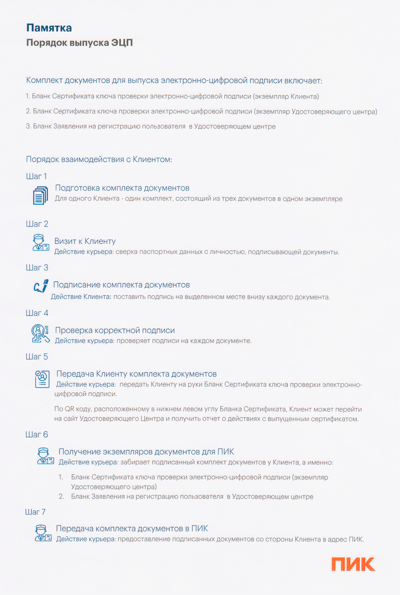 Выпустить ЭЦП. Застройщик прислал курьера, чтобы выпустить ЭЦП. Он привез два документа: заявление и два экземпляра сертификата на выпуск электронно-цифровой подписи. Заявление и один экземпляр сертификата я подписала и передала обратно курьеру. Второй экземпляр остался у меня.