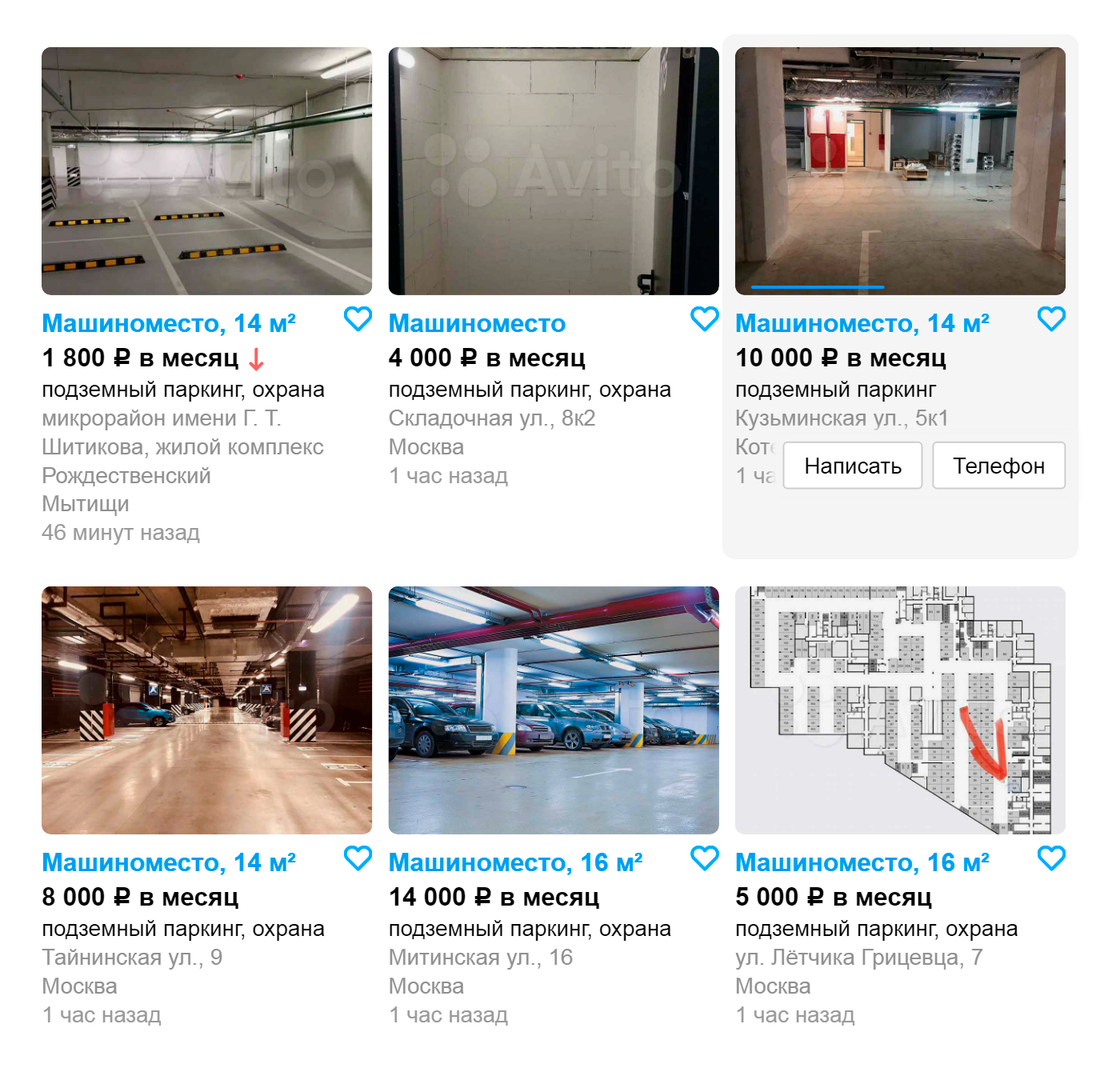 Предложения аренды машино-мест в подземных паркингах. Источник: avito.ru