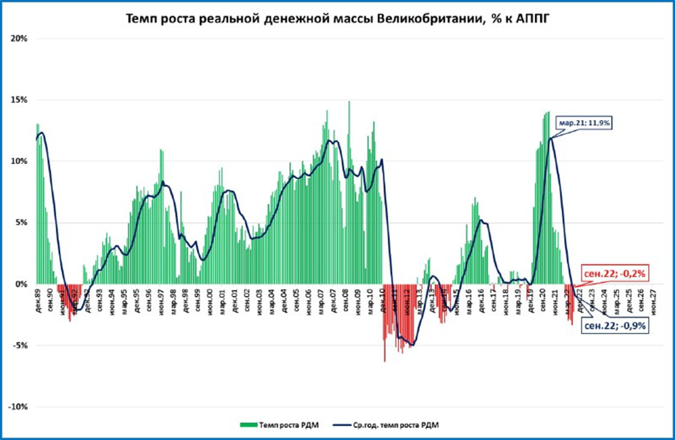 ● Инфляция в Британии достигла новых максимумов. Но денежная масса сейчас тоже растёт ускоренными темпами, догоняя рост цен. Падение реальной денежной массы (РДМ) в сентябре практически прекратилось. Это снижает риски в экономике.