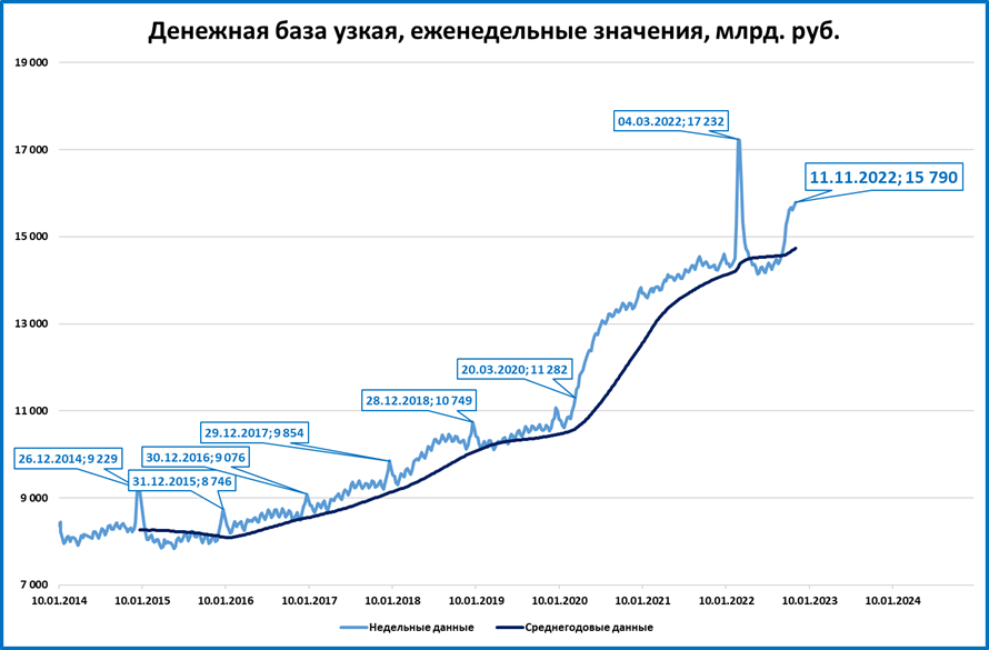 На 11 ноября узкая денежная база (УДБ – часть широкой денежной базы) выросла до 15,8 трлн рублей.