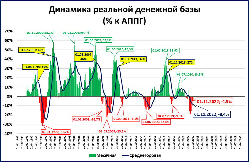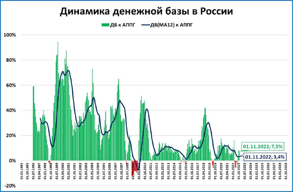 Прогноз: динамика реальной денежной базы продолжит улучшаться. Мы ожидаем, что темпы падения замедлятся или даже будет зафиксирован рост.