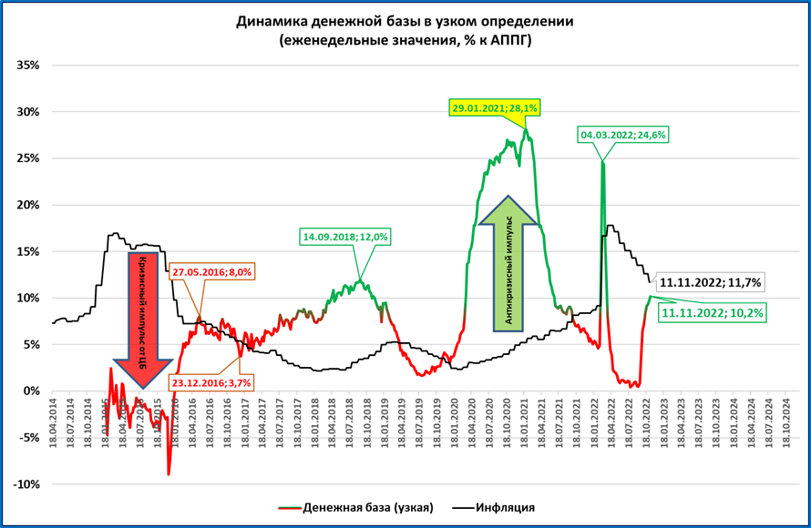● Узкая денежная база на 11 ноября впервые с марта показала двузначный (более 10%) рост. Позитив: отставание роста УДБ от роста цен сокращается.
