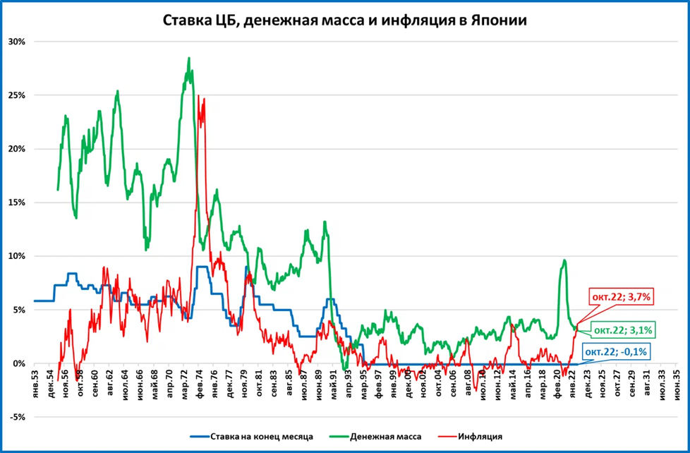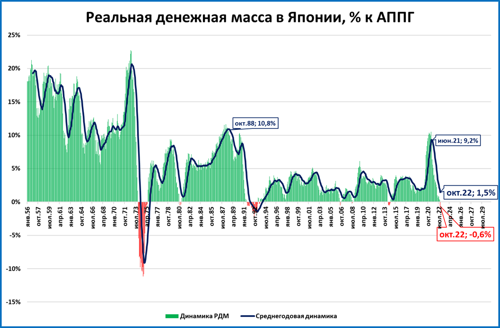 Но рост инфляции этому только мешает. И в Японии в октябре впервые за много лет реальная денежная масса начала сокращаться.