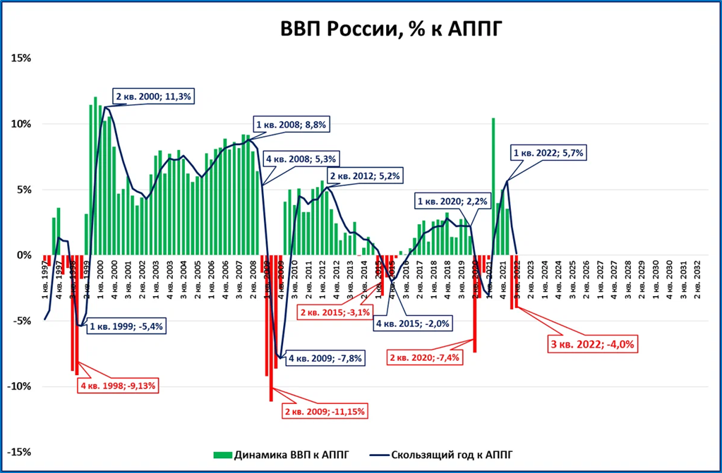 Обратите внимание: максимальное падение (-4,1% во 2 квартале) в нынешний кризис менее глубокое, чем во время пандемии 2020 года. По крайней мере пока.