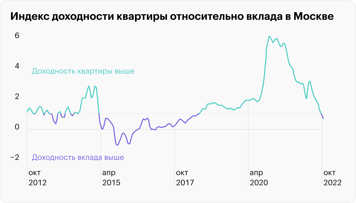 Индекс доходности столичного жилья от Irn.ru впервые с 2018 года опустился ниже единицы. Этот индекс показывает, во сколько раз доходность жилья — аренда плюс изменение цены квартиры — превышает доходность вклада в крупном банке. Если индекс ниже единицы, то доходность у квартиры ниже, чем у вклада.