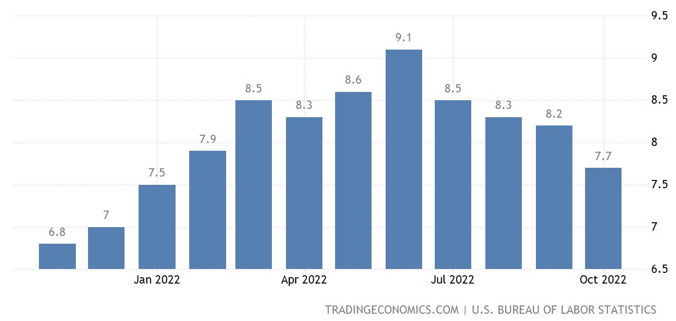 Действительно, годовой график инфляции в Штатах демонстрирует плавное снижение с июля. Более того, в октябре показатель снизился до минимального за 9 месяцев значения.