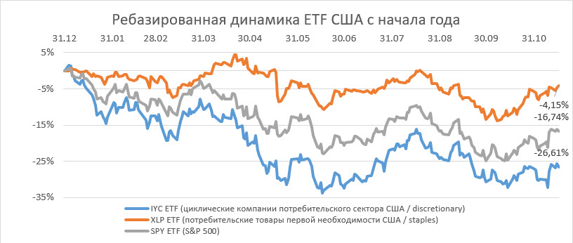 Из-за ухудшения макропоказателей США в текущем году и риска мировой рецессии в 2023 году акции таких компаний просели сильнее рынка. Некоторые компании индекса относятся к историям роста (например, Amazon, Tesla), которые негативно реагируют на повышение ставок, и агрессивная политика ФРС в текущем году оказала давление на акции подобных компаний и, как следствие, на стоимость фонда IYC.
