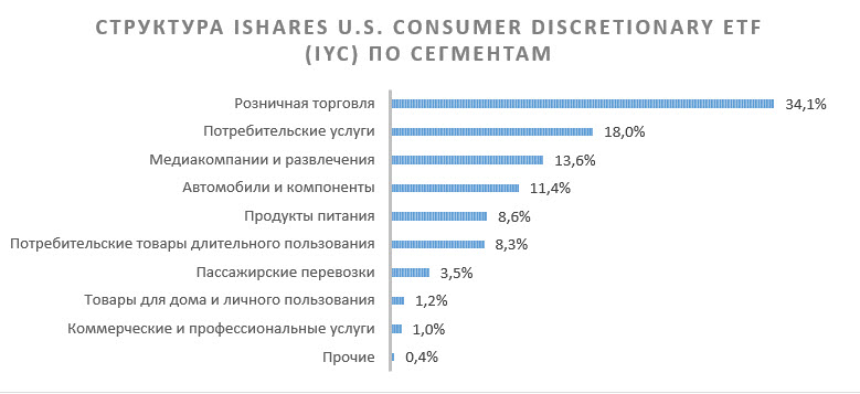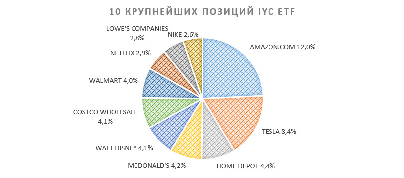 В состав ETF входят бумаги известных по всему миру Amazon, Tesla, McDonald’s, Netflix, Walt Disney. В индексе представлены эмитенты следующих секторов: розничная торговля, HoReCa (отели, рестораны, кейтеринг), пассажирские перевозки и различные услуги.