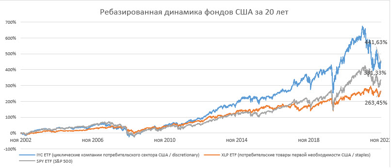 В условиях нормализации инфляции и восстановления экономики акции этого сектора могут показать опережающий рост. За последние 12 лет акции компаний циклического потребительского сектора в условиях растущей экономики показывали динамику, опережающую широкий рынок и эмитентов первичного потребительского спроса. Это обусловлено тем, что спрос на базовые потребности (продукты питания, товары повседневного спроса, табак) растет медленнее, чем на "желания" (ювелирные украшения, электроника, развлечения) при улучшении благосостояния людей.
