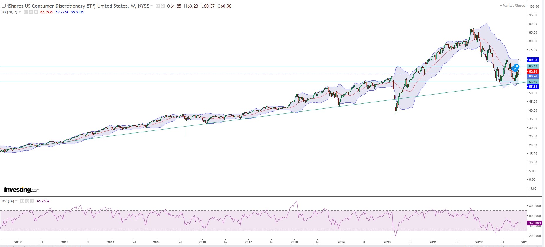 В состав iShares U.S. Consumer Discretionary ETF входят истории роста, такие как Amazon и Tesla, на рыночную капитализацию которых давит повышение ставки ФРС. Далее индекс состоит из компаний вторичного спроса, спрос на услуги которых более чувствителен к экономическим циклам, что может привести к углублению просадки на ухудшении макропоказателей США, в особенности относящихся к благосостоянию населения.