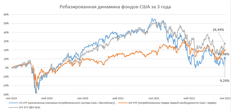 Бизнес компаний, входящих в индекс, чувствителен к экономическим циклам, поэтому их акции снизились в текущем году на фоне ухудшения макропоказателей США и риска мировой рецессии в 2023 году. Данный ETF с начала года снизился на 27%, тогда как широкий рынок показал более умеренное снижение, на 17%.