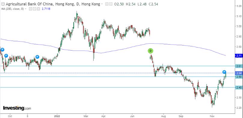 С точки зрения технического анализа на дневном графике акции AgriBank класса H в рамках отскока превысили уровень HKD 2,50. Ожидаем продолжения подъема с целью в районе HKD 2,61. В случае формирования снижения сильная поддержка расположена на отметке HKD 2,40.