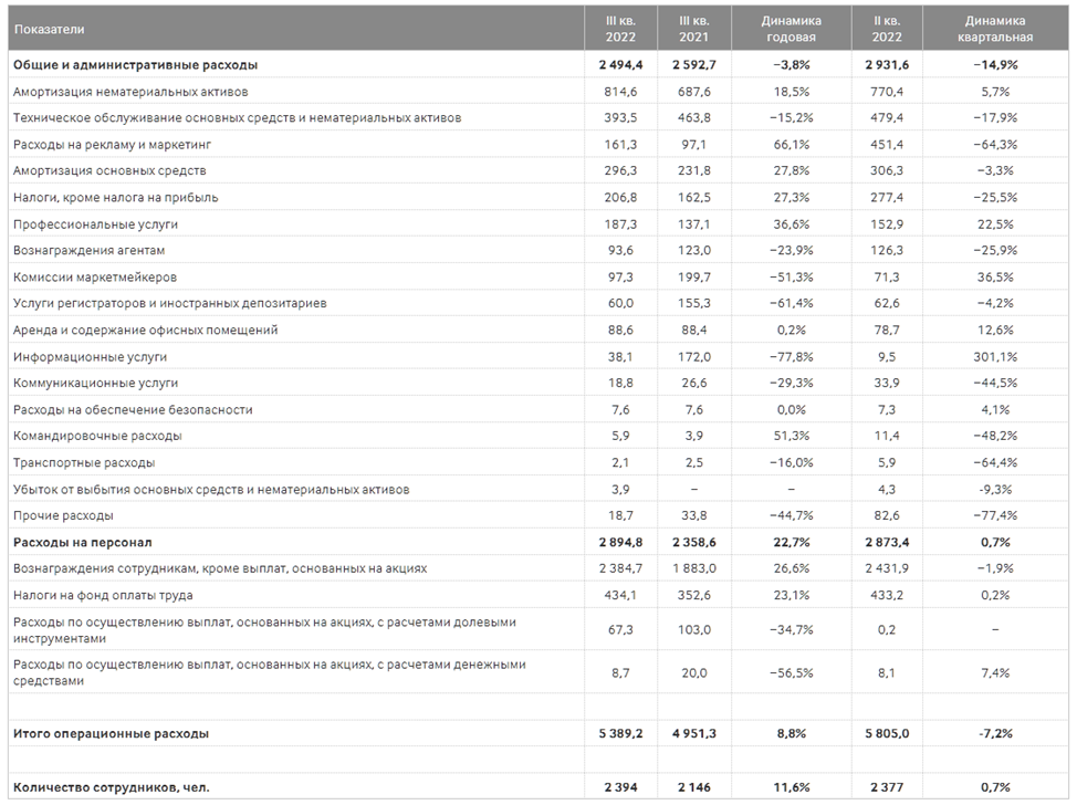Операционные расходы состоят из двух больших блоков. Это «Общие и административные расходы», которые снизились почти на 4% год к году до 2,5 млрд. А также «Расходов на персонал», которые наоборот выросли почти на 23% до 2,9 млрд. Это повышение произошло в основном из-за роста числа сотрудников на 11,6%.