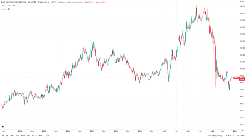 Мосбиржа провела IPO в начале 2013 года, с тех пор акции компании вырастали в 4 раза, но за последний год скорректировались на 55%. Основным драйвером падения стало начало специальной военной операции. Сейчас акции торгуются в районе 87 рублей. Эти цены были актуальны ещё 7 лет назад. Давайте разберёмся, почему так происходит, и стоит ли сейчас покупать акции этой компании.