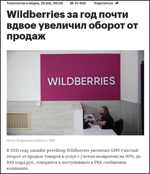 Причём они также стараются быстро расти. Например, Wildberries в 2021 году увеличил товарооборот на 93% до 844 миллиардов. К тому же, в отличии от Озона, это еще и прибыльная компания.
