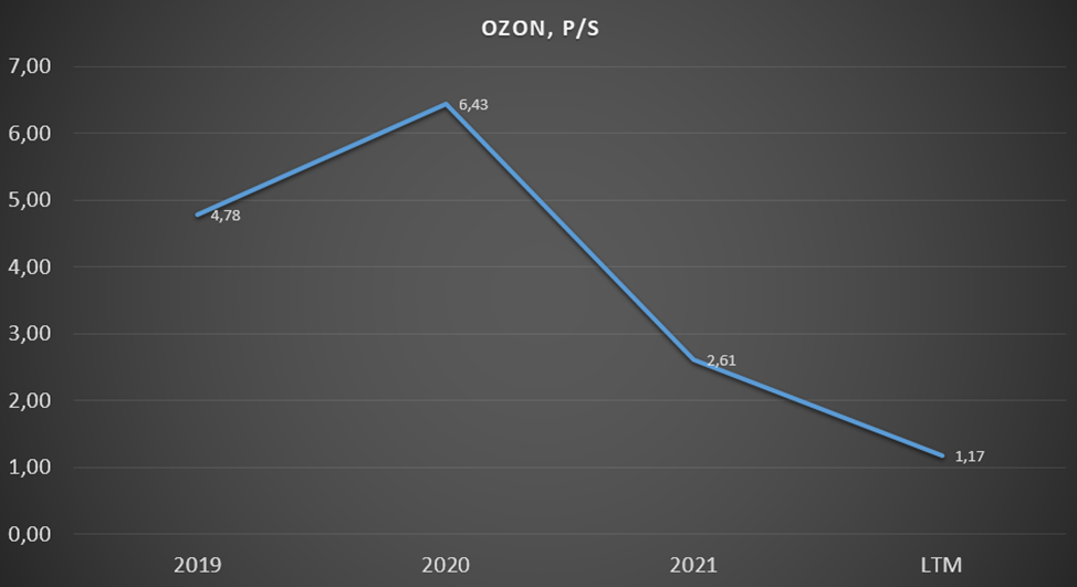 Годовая динамика выручки действительно впечатляет. Цифры увеличиваются практически по экспоненте. За 5 лет они выросли более чем в 6 раз. Таким образом, OZON – это действительно классическая акция роста.