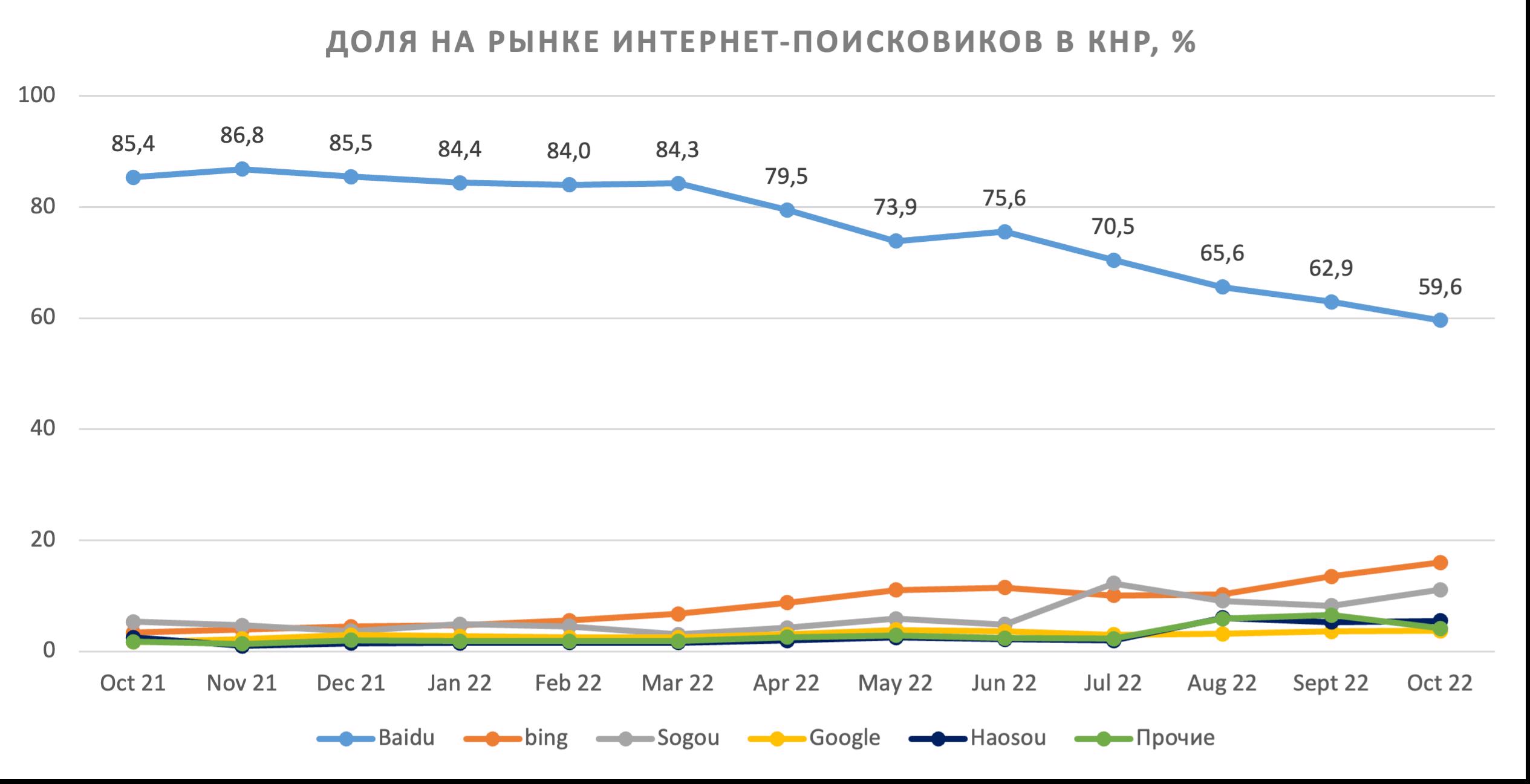 Доля Baidu в сегменте поисковых систем в КНР неожиданно упала до 60% в октябре 2022 года. Конкуренция Baidu с другими игроками обострилась в 2022 году, и одним из самых ярких проявлений стала увеличившаяся доля поисковика Bing с 4,4% в конце 2021 года до 16%. Кроме того, с начала года заметно прибавил и Sogou, увеличив долю с 3,7% до 11,1%. Baidu — по-прежнему выраженный фаворит среди поисковиков КНР, но критика в адрес компании в последние месяцы растет на фоне корпоративной политики жесткой цензуры.