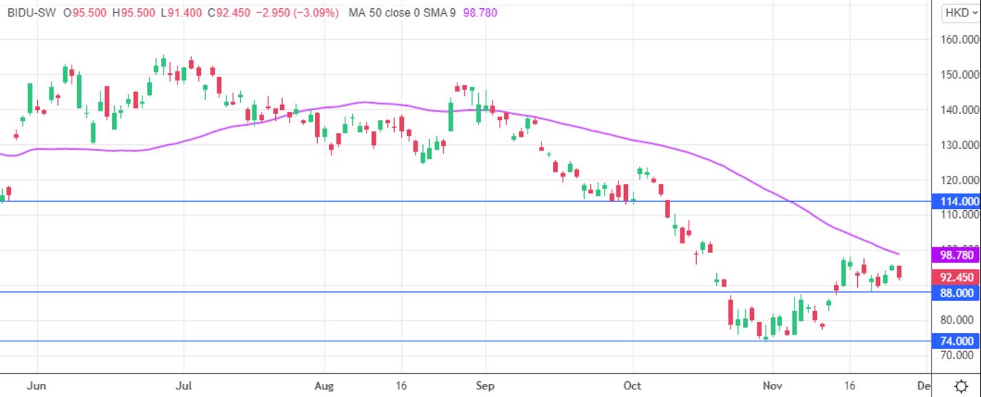 С точки зрения технического анализа на дневном графике акции Baidu оттолкнулись от поддержки HKD 74 и теперь консолидируются выше уровня HKD 88. Если инструменту удастся преодолеть 50-дневную скользящую среднюю на отметке HKD 99, то рост может продолжиться до сопротивления HKD 114.