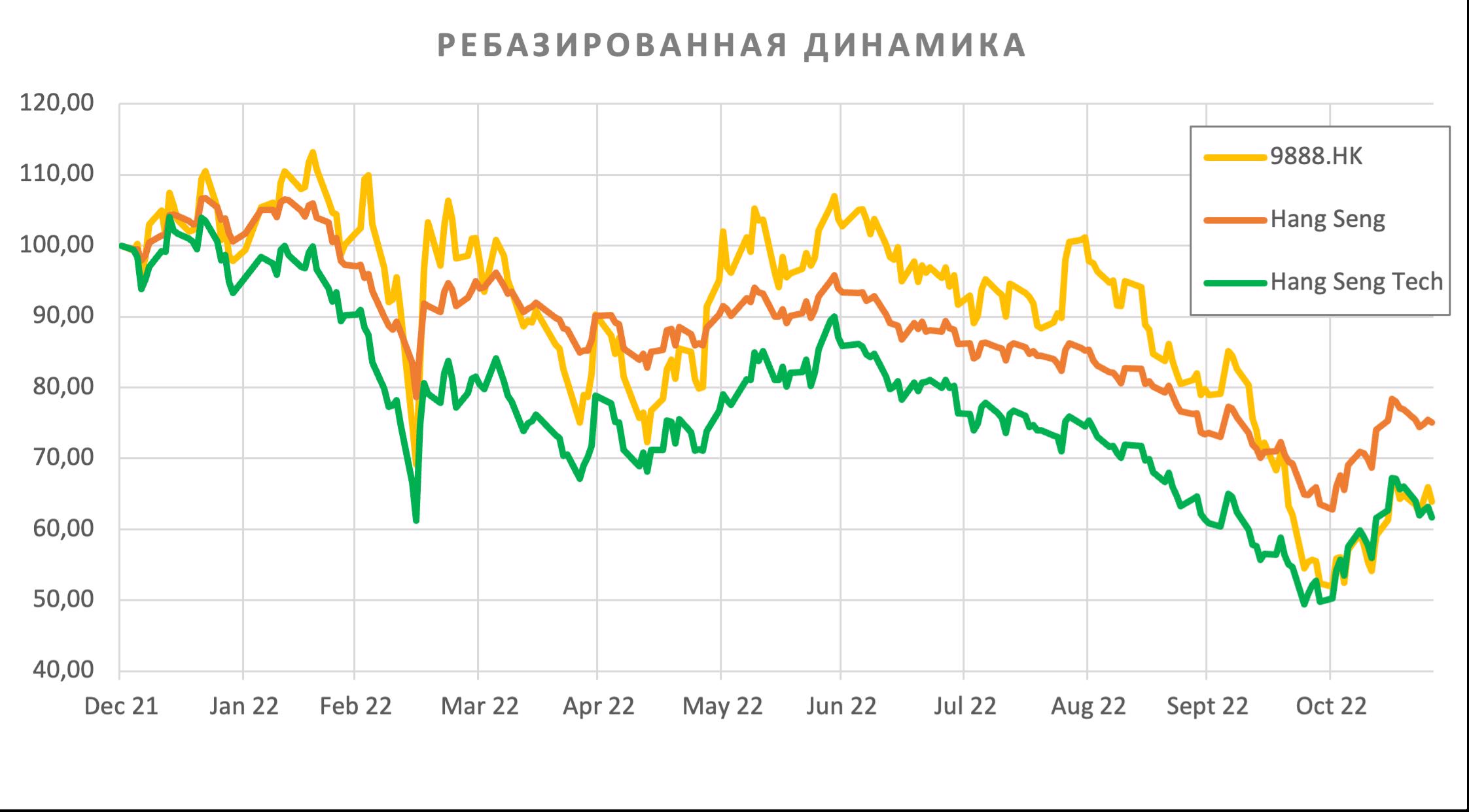 С начала 2022 года акции Baidu (-36%) смотрятся хуже широкого рынка Гонконга (-25%), но немного лучше технологического индекса Hang Seng Tech (-38%).