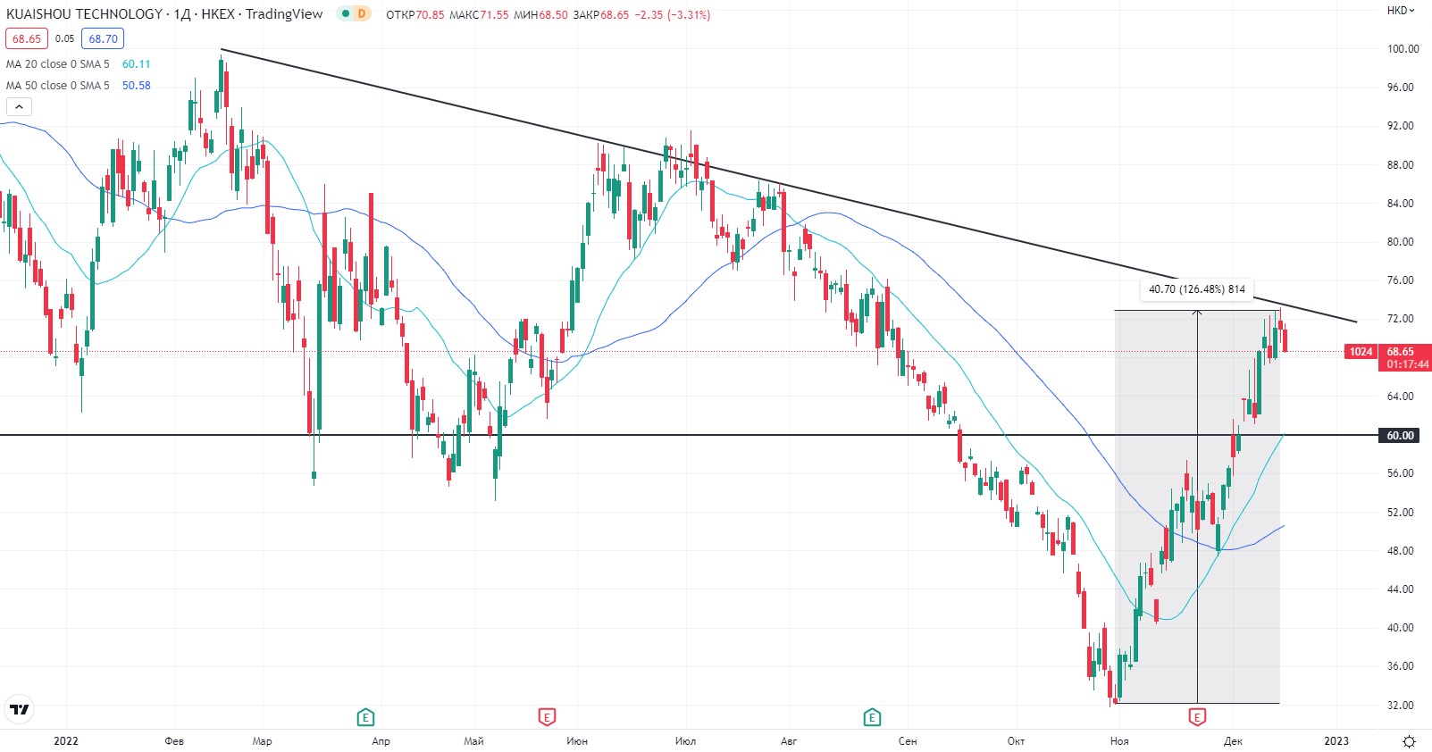 С июля по октябрь этого года акции Kuaishou без явных причин существенно отстали по динамике от индекса Hang Seng. Зато с октябрьских минимумов акции показали рост на 100%. Компания выгодно позиционирована в рекламной отрасли и демонстрирует хорошие результаты, несмотря на слабость национальной экономики. Ожидаем, что акции могут показать опережающую динамику в среднесрочной перспективе.
