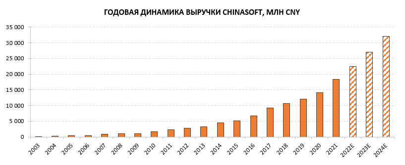 С момента выхода на биржу бизнес Chinasoft продемонстрировал 200-кратный рост. В 2003–2021 гг. среднегодовые темпы роста выручки компании составили 30%. В 2022–2024 гг. прогнозируется рост выручки в среднем на 20% в год.