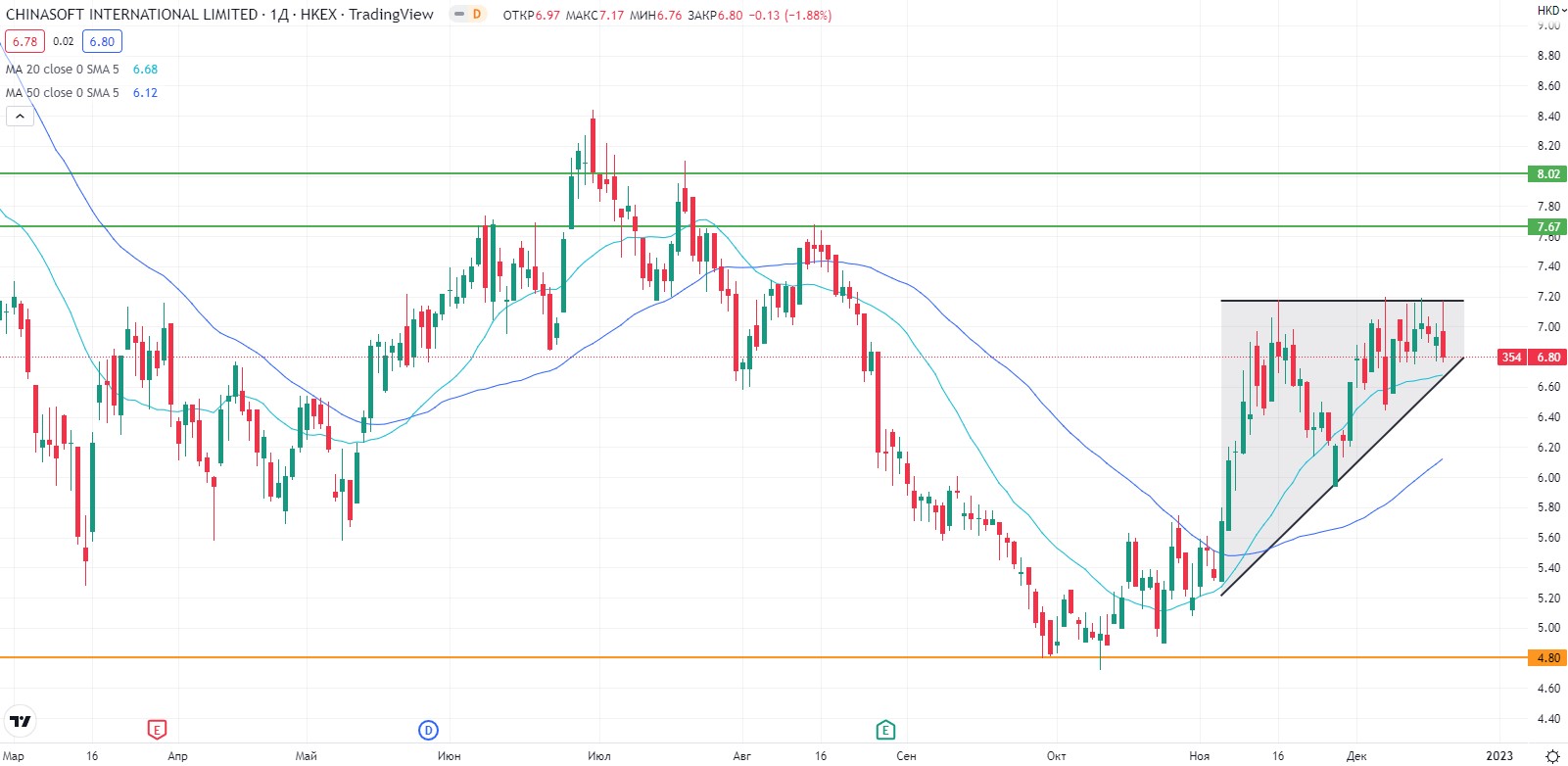 С октябрьских минимумов акции Chinasoft выросли уже на 50%. Если акциям удастся пробить сопротивление на уровне HKD 7,20 и выйти из треугольника, то ближайшей целью станут уровни HKD 7,70 и HKD 8,00.