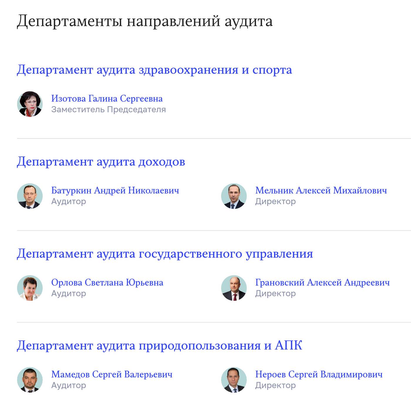 Департаменты направлений, возглавляемые аудиторами, также перечислены на сайте. Источник: ach.gov.ru