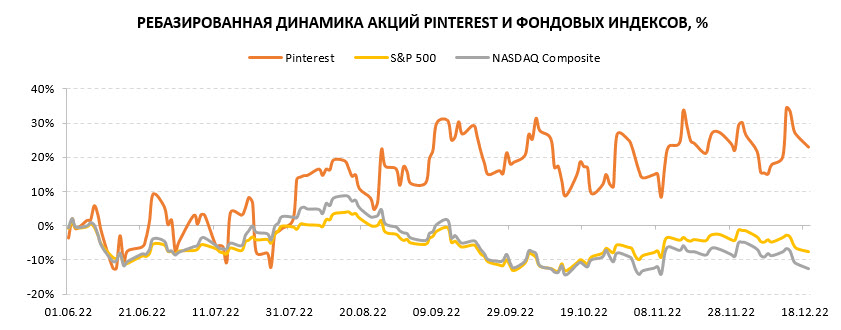 Последние полгода акции Pinterest выглядят значительно лучше широкого рынка и опережают по динамике индексы S&P 500 и NASDAQ Composite.