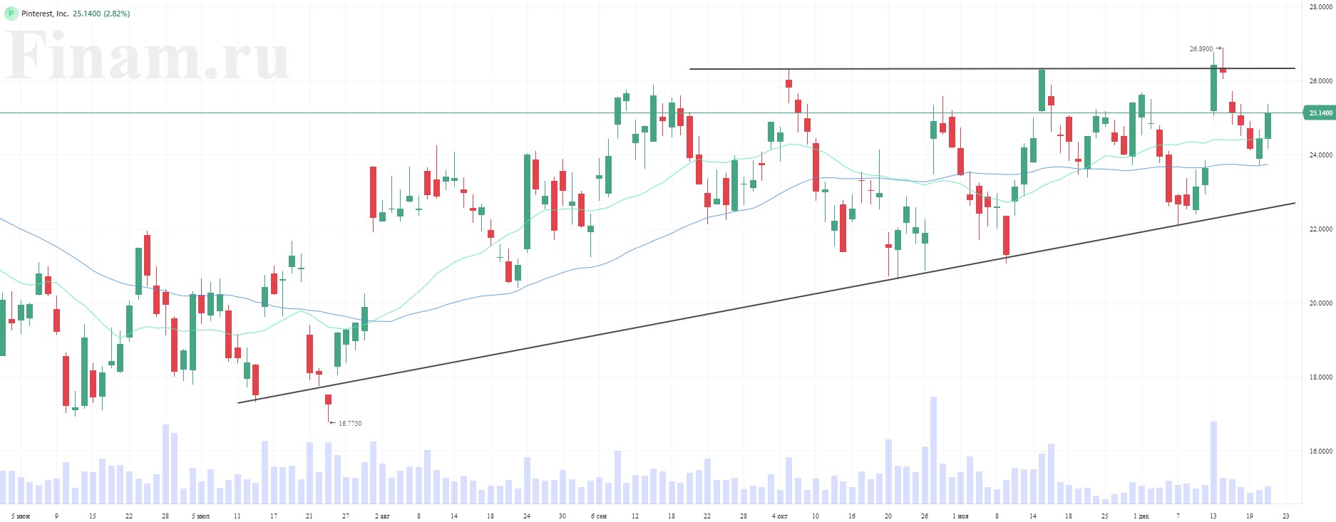На дневном графике акции Pinterest формируют треугольник с верхней плоской границей на уровне чуть выше $ 26. Мы ожидаем, что в ближайшее время акции продолжат движение в обозначенном диапазоне.