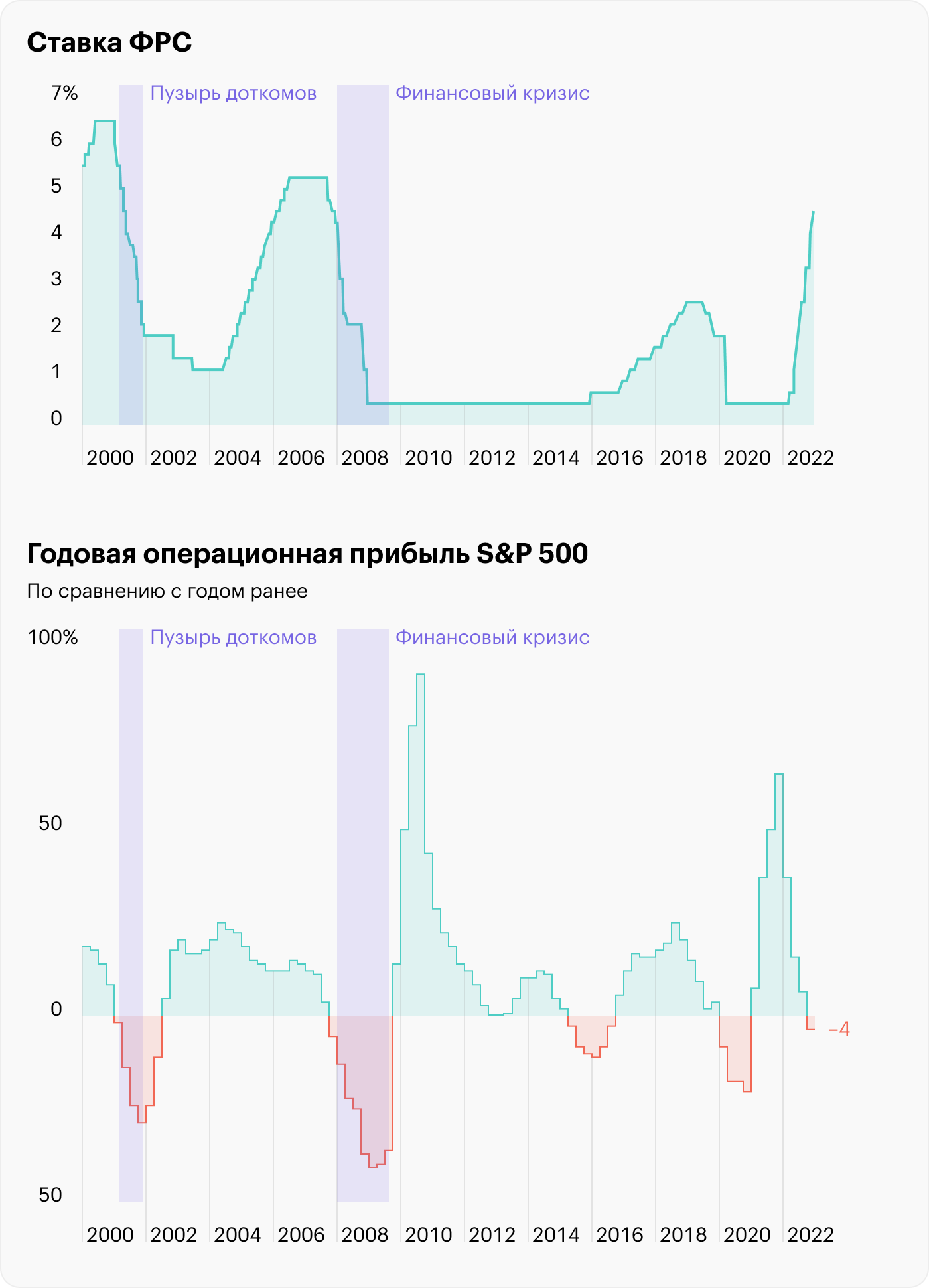 В 2023 году прибыль корпораций может упасть еще сильнее: как показывает история, высокая ставка ФРС часто приводит к рецессии. По словам Федрезерва, процентную ставку рассчитывают держать высокой в течение всего следующего года.