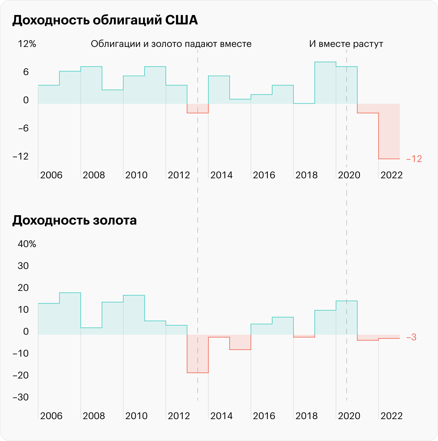 Немногим лучше доходность у золота, которое упало на процент. 2022 год подтвердил закономерность последних лет: золото не защищает от инфляции, а борется с другими безопасными активами за внимание инвесторов. И если облигации падают — то есть их доходность растет, — золото чувствует себя неуверенно.