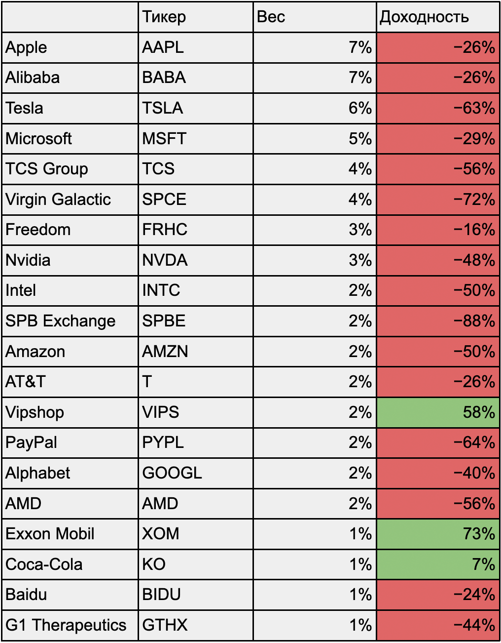 Доходность акций с большим весом в SPB100 без учета дивидендов. Источник: Тинькофф Инвестиции и СПб-биржа