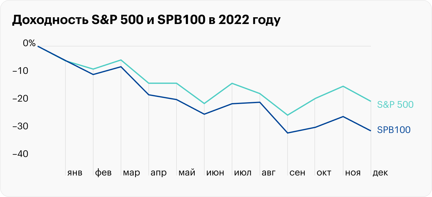 Индекс SPB100 — аналог народного портфеля от СПб-биржи — в этом году потерял в полтора раза больше, чем S&P 500, — 31 против 20%. Среднестатистический россиянин показал ужасную доходность, но и портфель среднего американца похудел не меньше — где-то на 35%.